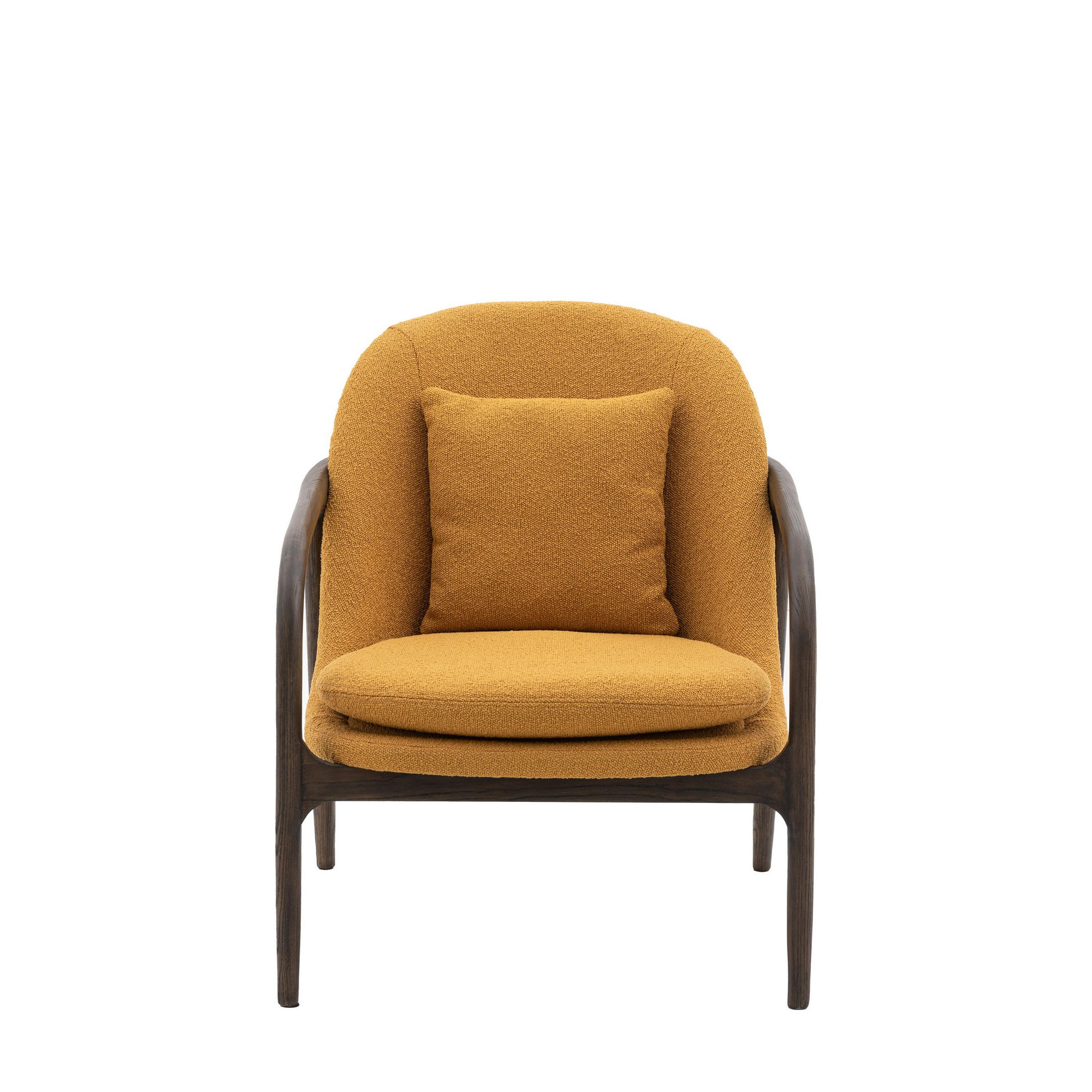Stylish and quirky Mid-Century inspired chair with hand curved sleek lines. The dark wood frame curves around the seat creating soft and sleek lines that are perfect for both modern and vintage inspired interiors. Upholstered in retro feeling yellow ochre fabric with a padded seat cushion and comfortable back cushion.