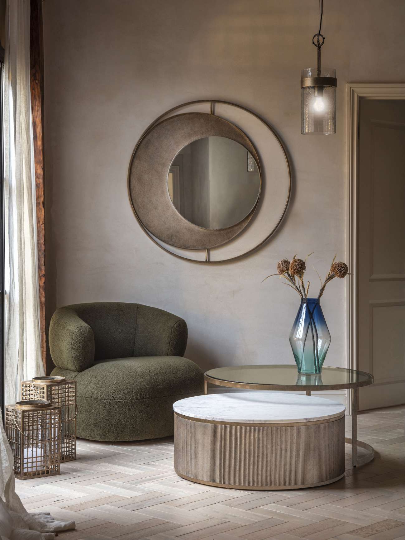 The Belvedere Set of 2 Nesting Coffee Tables are the ultimate in contemporary, space saving design. This beautiful table nest benefits from an aged gold finish on both sizes of table. The larger of the two has a smooth Aged Gold frame, with tinted glass, exudes a timeless charm. Manufactured using a specialist production methods which creates beautiful variances in glass colour, making each item unique and individual. Visible through the glass is the smaller table, measuring w:80cm x d:80cm h:32cm, which features a stunning natural white-grey marble top and corrugated metal sides. Recommended Care Guide •Glass: Clean with a soft, lint-free cloth and glass cleaner. Dry with a clean cloth to prevent streaks.