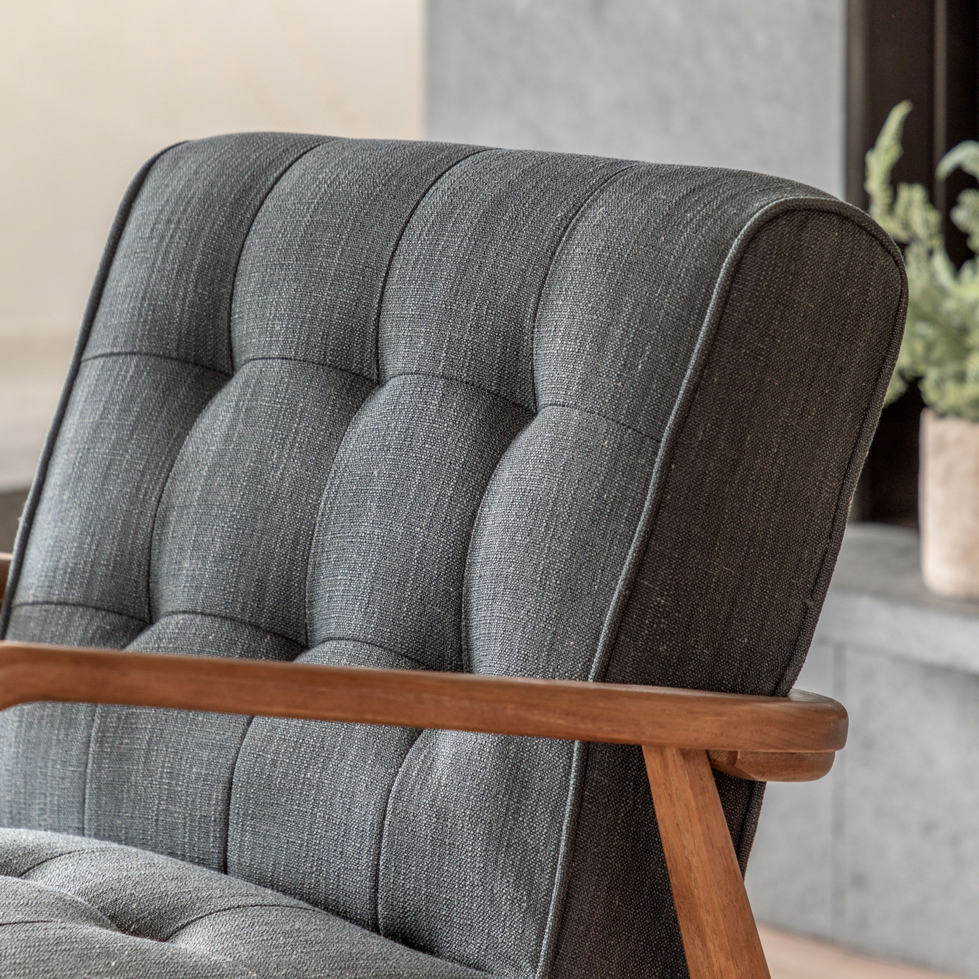Mid century stand out personality piece with a solid oak angled frame twinned with soft dark grey linen upholstery and decorative deep pull detailing.
