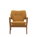 This remarkable Mid-Century style chair features an elegantly shaped solid oak wood frame which makes it a stand out piece in any interior. It is upholstered in ochre boucle style fabric with button details and a soft cushion for comfort.