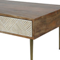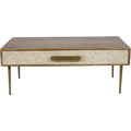 Introducing our Linden furniture Collection. Sustainable Mango wood frames encase ethically sourced bone in a calm ivory colour palette with aged gold metal handles and legs. Bone inlay is expertly applied to panels in a geometric formation, and paired with a complimentary toned soft grey resin. The natural beauty of the wood is visible on the top of this coffee table.