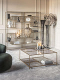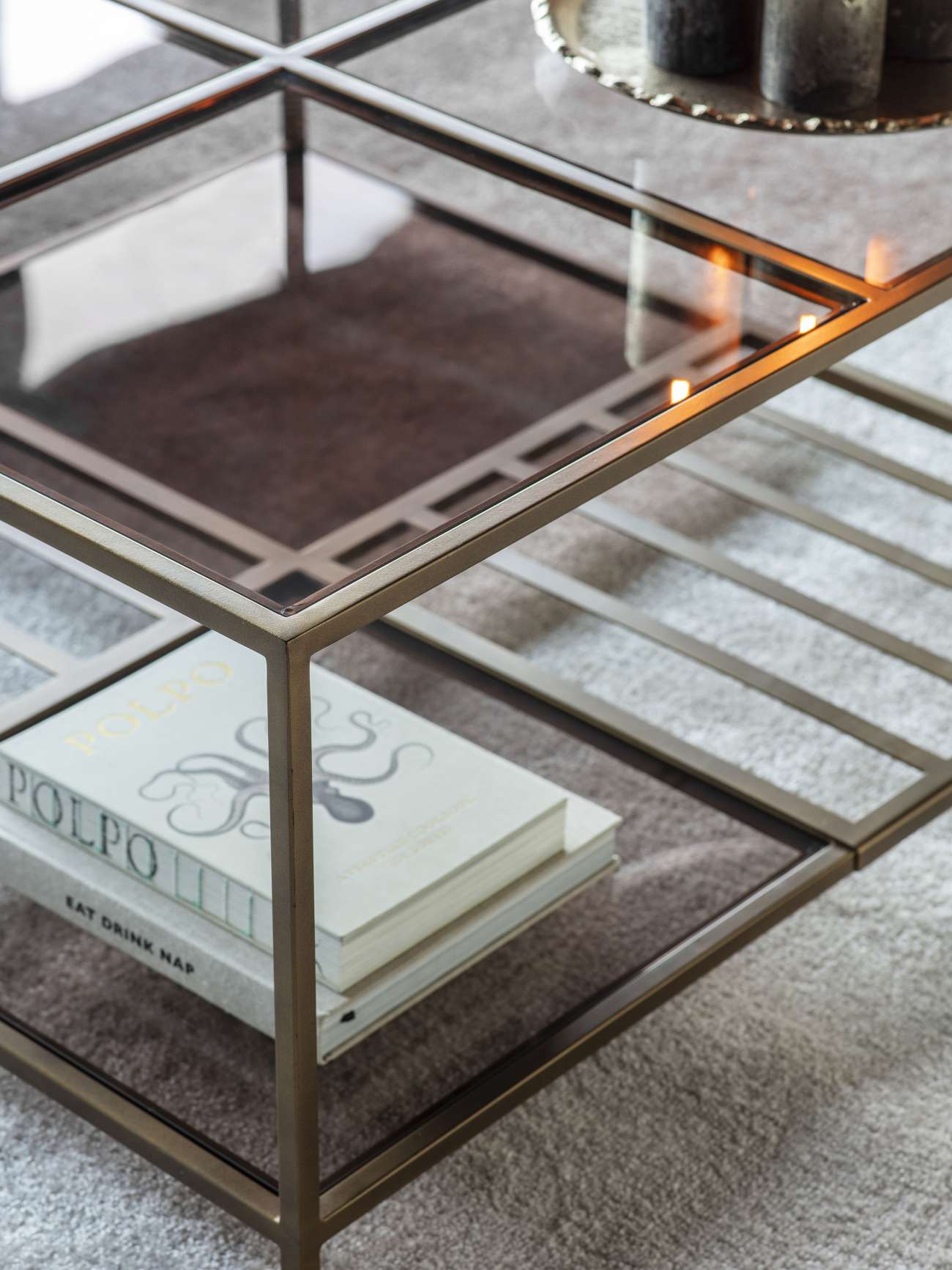 The Westley Coffee Table is a real statement piece of furniture measuring 90cm x 90cm square. It features a floating warm brown tinted glass top, and a Dark Gold finish on its metalwork frame, and is reminiscent of luxury hotel interiors or modernist design, with its exposed metal frame and unusual square grid configuration. Useful additional storage is made available through the use of metal slatwork on the lower sections of the table. The Westley coffee table can be paired with our matching Westley Set of 2 shelving units.